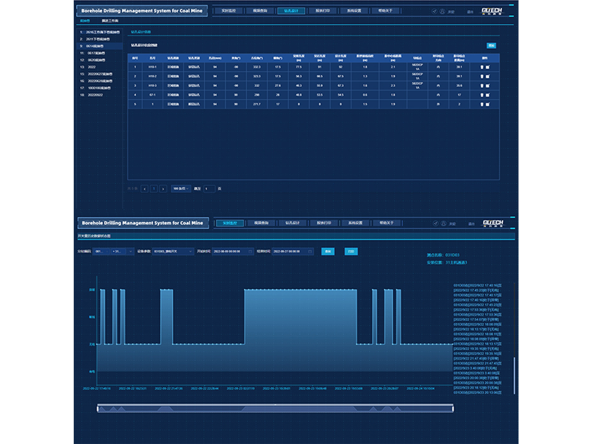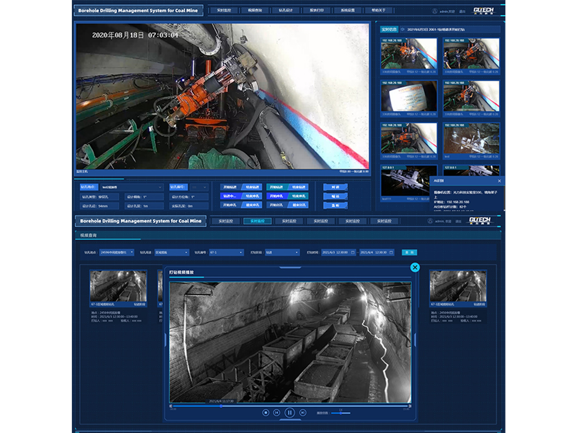 KJ1661 drilling rig and borehole drilling process management system integrate technologies of the automated drilling rig, video surveillance, environmental monitoring, intelligent analysis, communication transmission, and information management, achieving functions such as automatic video-based drill rod counting and two-way voice intercom. This system manages the entire borehole drilling process in underground coal mines, recording drilling parameters, automatically segmenting, and storing videos for later retrieval, monitoring the environment, and implementing power-off interlock.