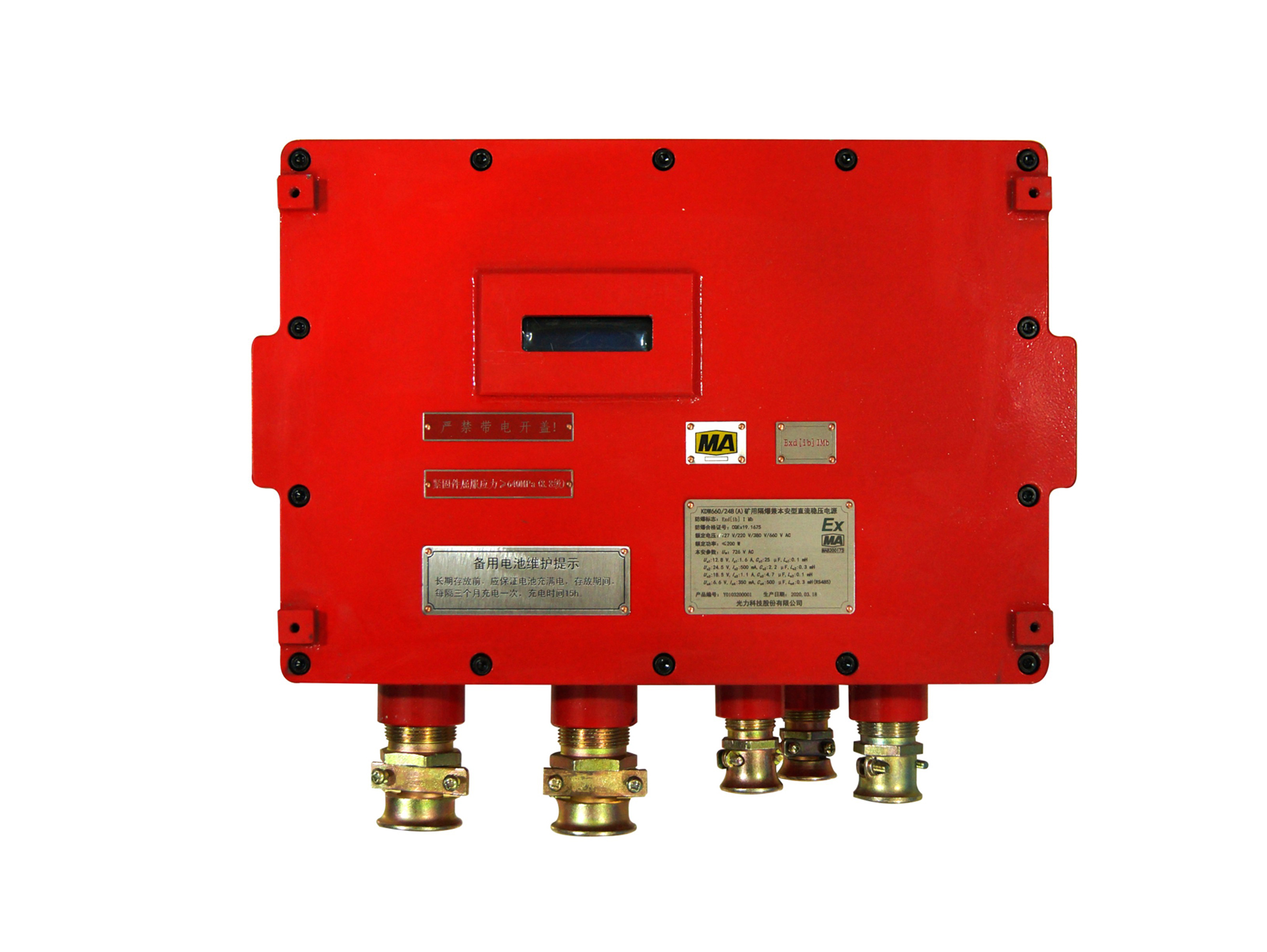 The KDW660/24B(A) intrinsically safe and explosion-proof DC power supply for mining (hereinafter referred to as the power supply) is mainly used for safe power supply to shearer controllers and other related equipment. It has functions such as voltage regulation, overload, short circuit, and overvoltage protection, and it can replace a battery pack in a mining environment.