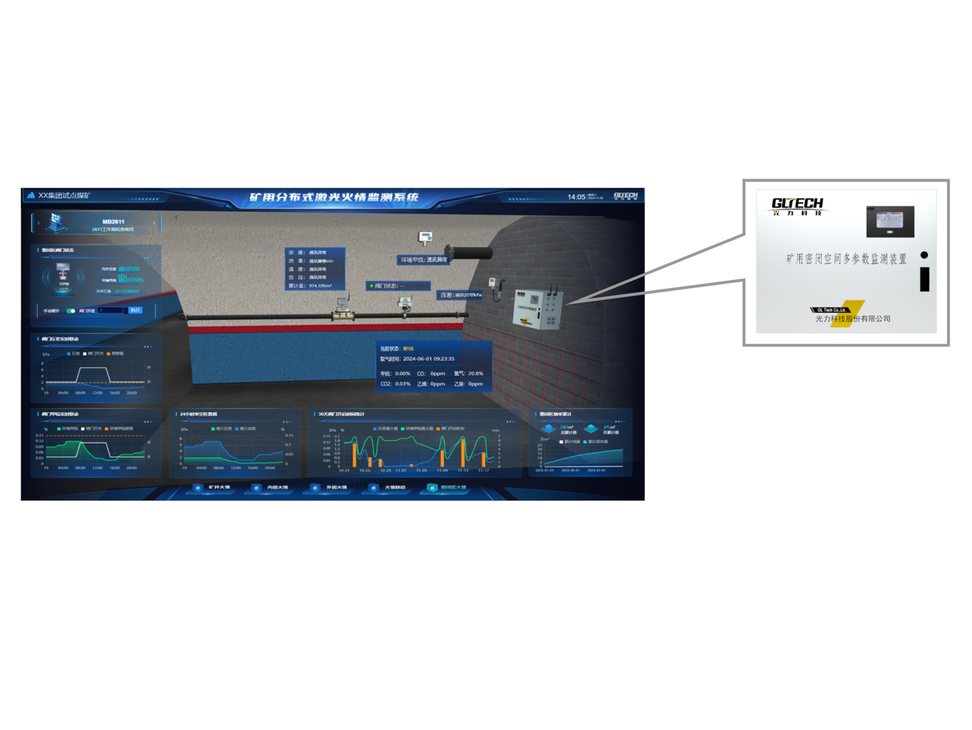 In accordance with Article 79 of the "Coal Mine Fire Prevention and Extinguishment Regulations," it is mandatory to establish a comprehensive observation system for sealed areas. Regular measurements must be conducted to determine the pressure difference inside and outside the sealed area, as well as the concentrations of methane, oxygen, carbon monoxide, carbon dioxide, and air temperature. This facilitates air leakage analysis and helps in understanding the spontaneous combustion trends within the sealed area. The multi-parameter monitoring device for mining enclosed spaces is designed for gas monitoring and intelligent extraction in coal mine enclosed spaces (such as goafs). It incorporates advanced technologies such as laser gas detection, wireless transmission, data analysis, and intelligent control, providing a comprehensive solution for precise fire monitoring, intelligent early warning, and extraction regulation in coal mine enclosed spaces (goafs).